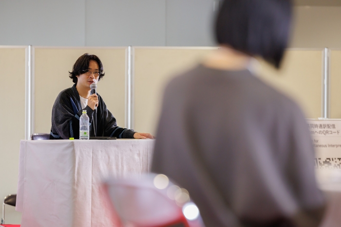 制作にあたってのトラブルは?と田口さんに問われ、「人気者だった祖母の部屋にこもって作業していたら、朝になると近所のおじさんたちが窓をノックして祖母の位牌に「おはよう」って言ってくる。それがうるさくて、窓に〈赤ちゃんが寝ています〉って貼り紙をしたら静かになりました。それが一番のトラブルでしたね」と会場を笑わせました。