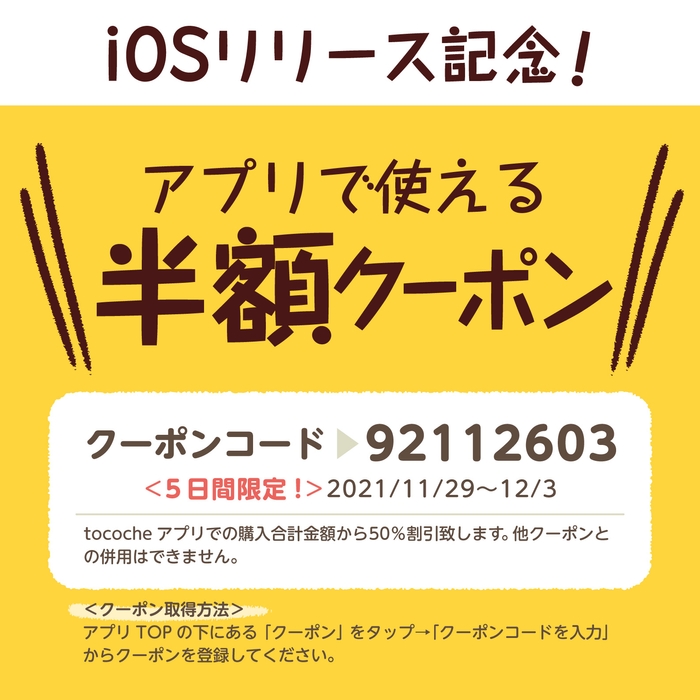 iOS版アプリリリース記念としまして、「2021/11/29(月)~12/3(金)」の5日限定できぐるみキーホルダーが半額になるお得なクーポンを配布中です。