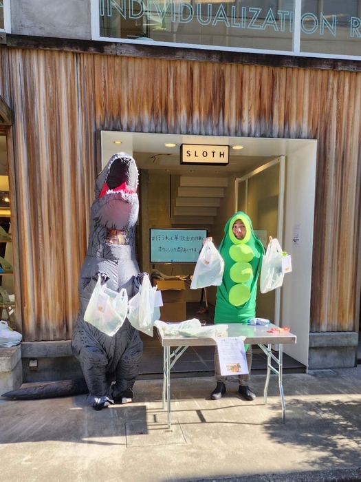 これなら大丈夫と確信、社員一同で着ぐるみを装着し(?)、弊社コワーキングサロン「SLOTH」の前で配布スタート!