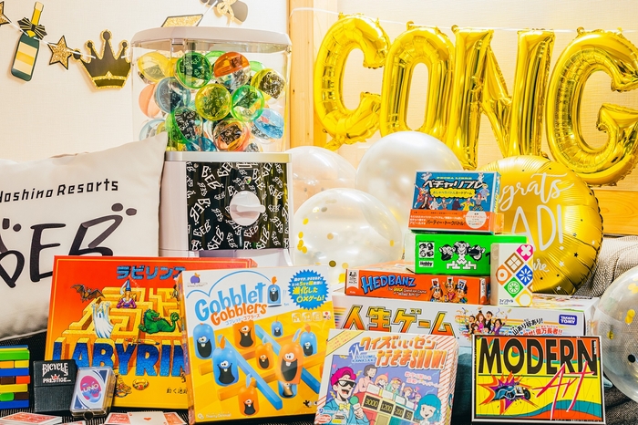 仲間との旅の醍醐味といえば、夜更かし!客室には、さまざまなトークテーマが出てくる「おしゃべりガチャ」が設置されています。夜通し、学生時代の思い出話に花を咲かせるのもおすすめです。また、みんなで盛り上がれる定番ゲームやプレイに 1 時間以上かかるマニア向けのものなど、10 種類以上のボードゲームや、お部屋を装飾できる風船やガーランドも用意しています。