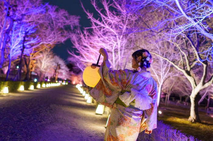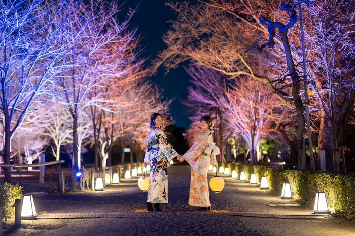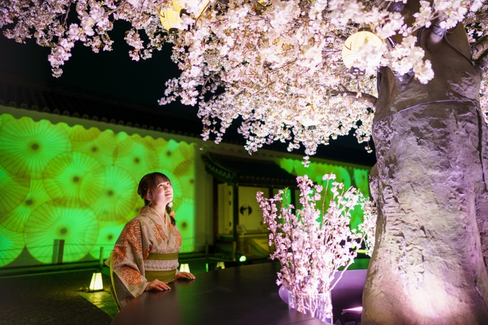 和楽器が奏でる優美な音楽とフローラルなアロマの香りに包まれる空間で、多様な品種の桜を楽しめるライトアップ。ライトアップの色が変化する演出とともに、その時だけの桜に出会えます。