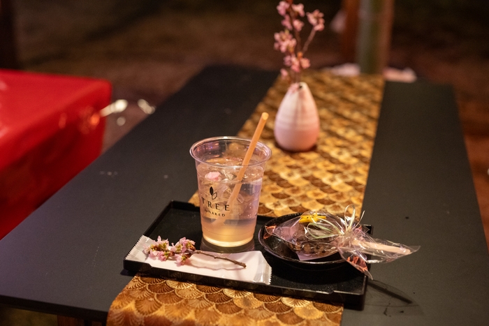 お花見といえばの飲食エリアはネイキッドの桜アートに包まれる空間にとなっております。さらに飲食メニューは桜のアルコールやドリンク、スイーツなど桜づくしのメニューをラインナップとなっております。