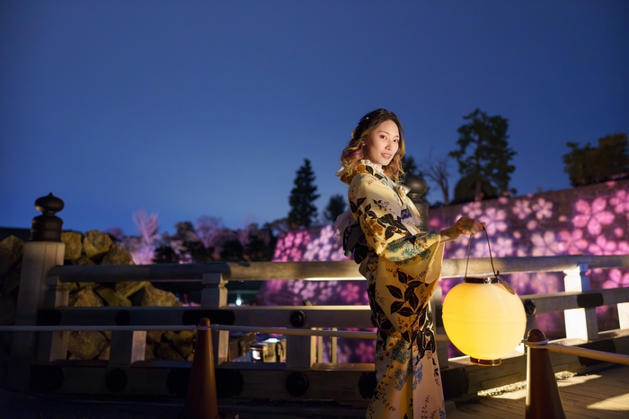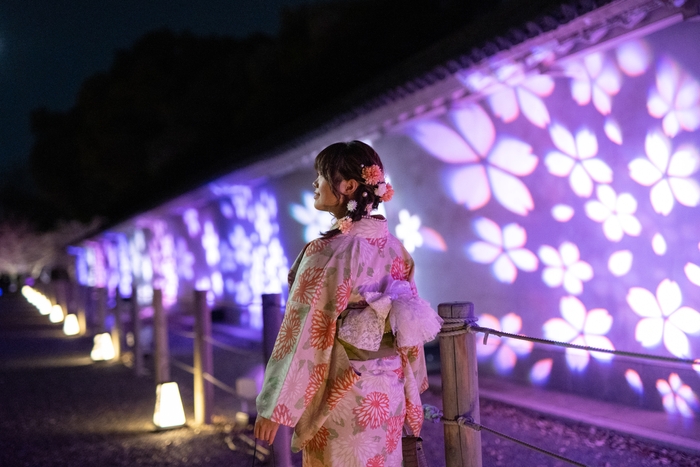 桜の花びら模様が城壁一面を彩るライトアップがなされています。ひらひらと舞う桜吹雪をイメージしたライトが足元を照らし、桜の園へと誘います。