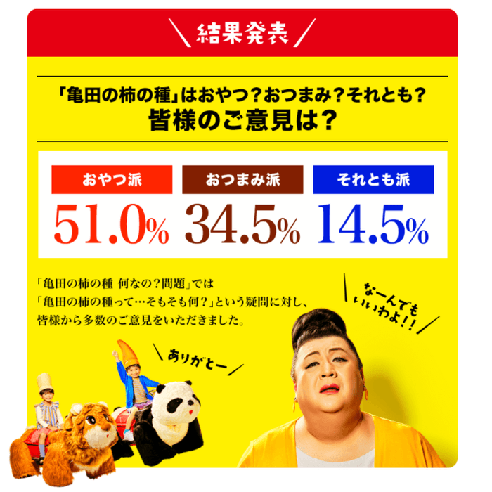 「亀田の柿の種 何なの?問題」キャンペーンの結果、“おやつ派”が51%の支持を集め、“おつまみ派”を上回る結果となりましたが、“それとも派”も含め、様々なアドバイスをお客様よりいただきました。