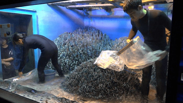 最初は東京・池袋にそびえ立つビルの屋上・地上40メートルに位置する「サンシャイン水族館」。約1000匹の魚を移動させ、巨大水槽の水をすべて抜いて行う「落水清掃」に密着しました。