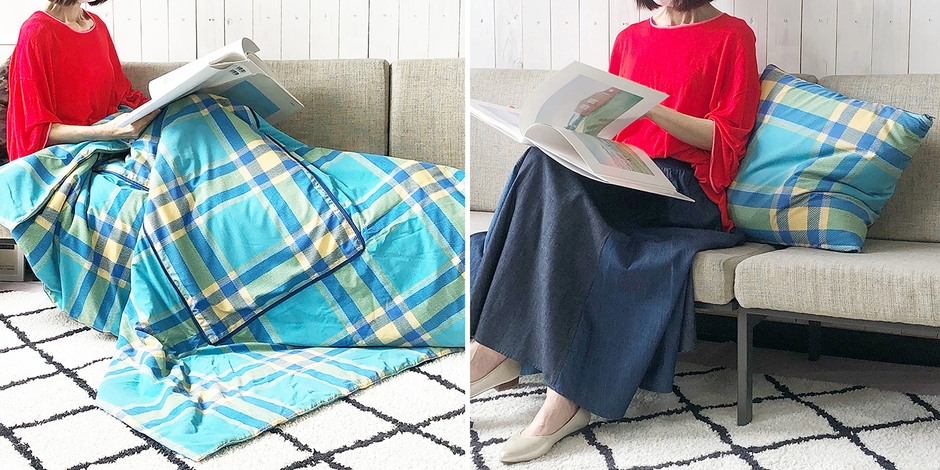 ファスナーによって開けた状態だとブランケットになり、畳んで閉めるとクッションにもなります。用途としては災害時に使えるほか、保温性が高いのでキャンプなどのアウトドアやリモートワークやおうち時間、ベッドまわりなどのインテリアとして使用可能。