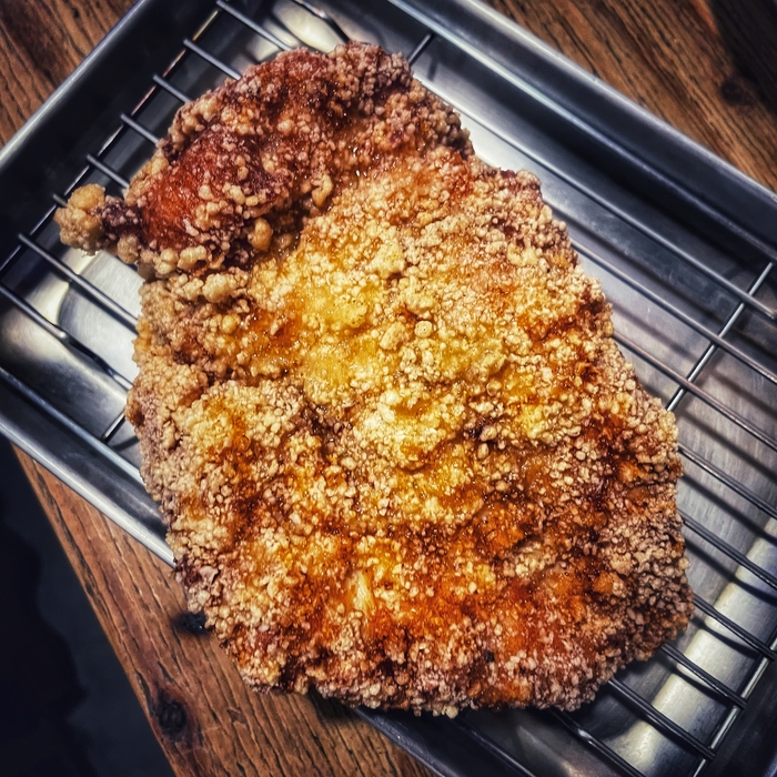鶏胸肉を五香粉で揚げたビッグサイズのジーパイは、衣の粉を台湾の家族から直送。