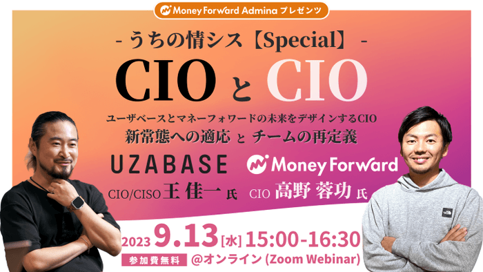 『マネーフォワード Admina』を提供するマネーフォワードi株式会社(以下、当社)は、2023年9月13日(水)にオンラインイベント、「うちの情シス【Special】CIOとCIO」を開催します。