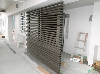 完成写真でもわかるようにエス・ウッドルーバーを付けることによりマンション全体のデザインもとてもおしゃれになりました。ルーバーの奥には、ご入居者様の玄関がありますので、目隠しにもなっております。再生木材なので風雨にも強いし、最適の商品になったと思います。