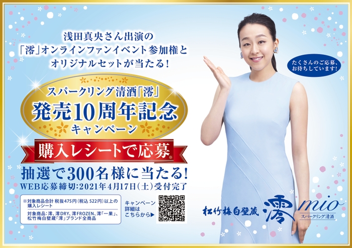 対象商品の購入レシート(税抜475円以上、税込522円以上)でWEBにて応募いただき、抽選で300名の方に、浅田真央さん出演の「澪」発売10周年記念オンラインファンイベント参加権と、