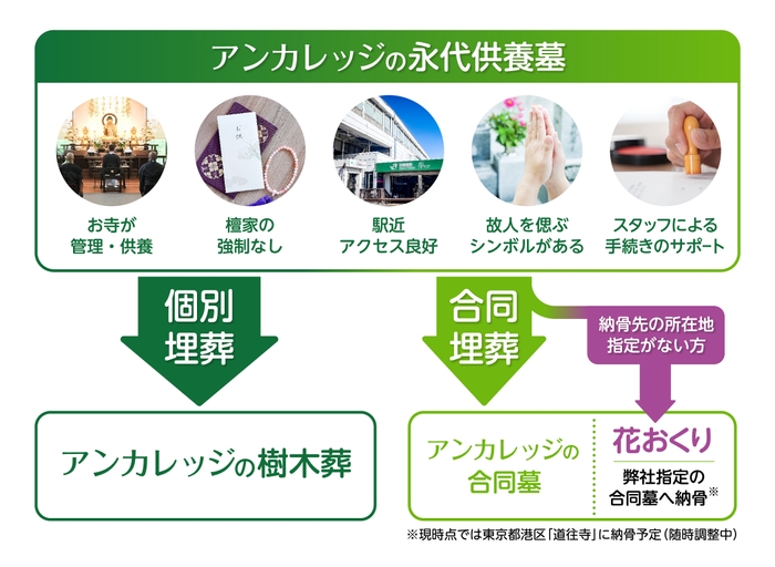 アンカレッジの永代供養墓(樹木葬・合同墓)は、お寺が永続的に管理をするので、後継ぎ・墓じまいが不要です。檀家の強制もありません。また、駅やバス停から徒歩圏内でアクセス良好なところが多いです。個別で埋葬され、そのシンボルがあるので、目の前で手を合わせ偲ぶことができます。