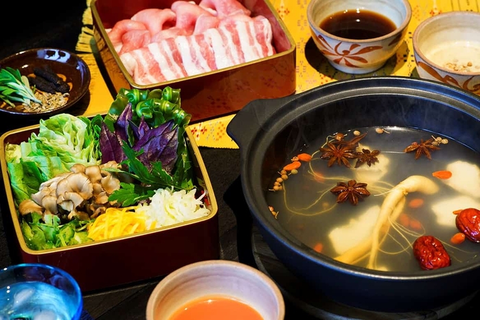 朝鮮人参にシナモンや八角などの薬膳スープのしゃぶしゃぶ。つけダレは生姜や花椒のピリ辛ダレ