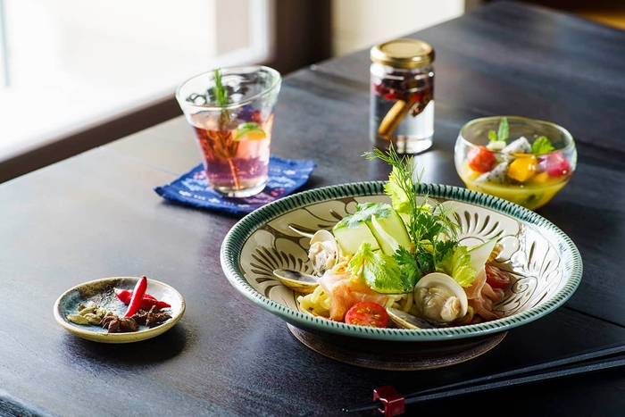 琉球王朝時代より、各国との交易によって伝来したスパイスは、昔から日々の食事や宮廷料理にも取り入れられてきました*2。到着後は、星のや沖縄内のキッチンスタジオ「ゆがふキッチン」で、琉球王朝時代から親しまれるスパイスの使い方や歴史的背景について学びます。また、キッチンに併設したガーデンから「島唐辛子」や「カラキ」など沖縄特有のスパイスを摘み、予め用意した丁子(クローブ)やウコン等と一緒に、オリジナルのスパイスシロップを作ります。シロップは、お湯やソーダとあわせ、滞在中に気軽に楽しめる他、持ち帰ることも可能です。