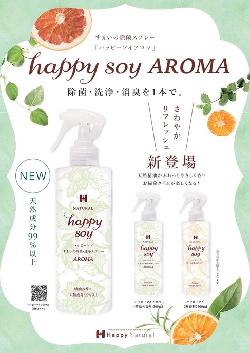 新型コロナウイルスの蔓延への対策が課題となる中、食用大豆からできたすまいの除菌スプレー「ハッピーソイ」の売上が、前年比20倍へと大幅に増加し、除菌スプレーの需要が高まっていることから、この度、さらに天然精油を100%使用した、香り付きの除菌スプレーを新発売します。
