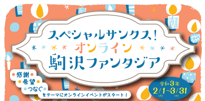 駒沢ファンタジアにご来園いただいたお客様やご協力いただいた関係者のみなさまへ『感謝』を、 次回のイベントは皆様と笑顔で再開できるよう『希望』を、人と地域を結び、新たな出会いに『つなぐ』をテーマにオンライン駒沢ファンタジアがスタートです。ぜひお楽しみください!