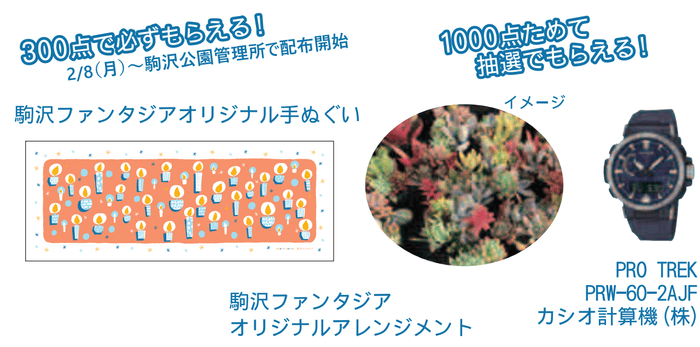 1000点ためて応募すると抽選で、多肉植物のアレンジメント、腕時計、防災セット、非常食、ヨガマット、レジャーシートなどの素敵な景品がもらえます。『駒沢ファンタジアオリジナルアレンジメント』は、GREEN JAMさんがオススメの多肉植物を使ったアレンジメントを特別に作ってくださいます。ぜひゲットしてくださいね。