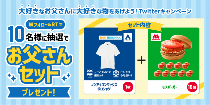 青山商事株式会社(本社:広島県福山市/代表取締役社長:青山理(おさむ))は、父の日をテーマにしたTwitterキャンペーンを6月13日(月)10:00から開催します。今回は株式会社モスフードサービス(本社:東京都品川区、代表取締役社長:中村栄輔)とコラボレーションして「Wフォロー&リツイートキャンペーン」を企画。参加いただいた方の中から抽選で10名様に、夏に人気の仕事服「ビズポロ」1枚とモスの定番「モスバーガー」10個分のデジタルギフトをセット(お父さんセット)でプレゼントします。両社による初めてのSNSコラボで父の日を一層盛り上げていきます。