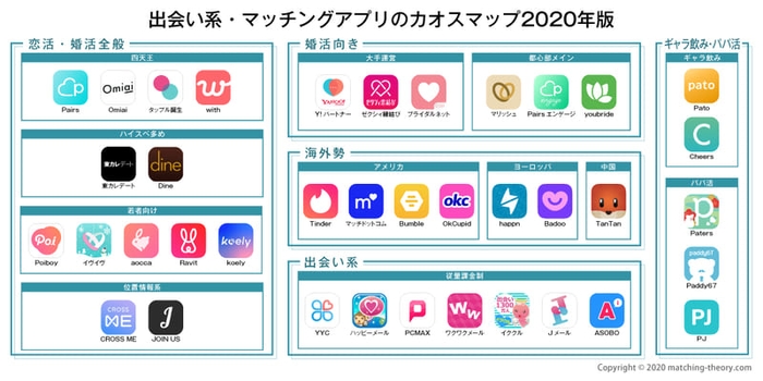 マッチングアプリの攻略サイト「マッチングセオリー」を運営する株式会社メディアセオリー(本社:東京都港区、代表取締役:小嶋大貴)は、男女の出会い系マッチングアプリをカテゴリごとに分類した『男女の出会い系・マッチングアプリのカオスマップ2020年版』を作成・公開いたしました。