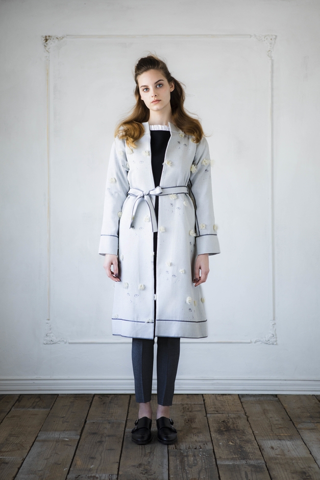 この他にも、留学していた頃を回顧しコレクションに反映させた全6型を製作。真っ赤なタータンチェックのコートや清楚な印象ながらもサイドに大きくスリットが入ったワンピースもオリジナルテキスタイルからデザインしています。