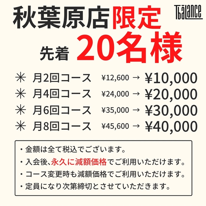 秋葉原店20名様限定!10月入会で、月会費が最大¥5,600も『永久に』お得になるキャンペーンを実施中!