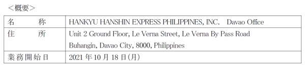 当社フィリピン現地法人である阪急阪神エクスプレス(フィリピン)は、ミンダナオ島の主要都市であり農業関連産業が盛んなダバオ市に事務所を開設し、10月18日より営業を開始します。