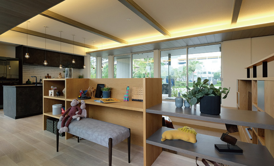 壁は設けずに家具やインテリアで空間を仕切ることで、空間のつながり、家族のつながりが感じられながらもパーソナルな空間も保てます。例えば、オープンシェルフや本棚も空間を分けるインテリアとして活用できます。また、机の方向を外向けにすることで、部屋の中でも別途コーナーを作ることも可能です。