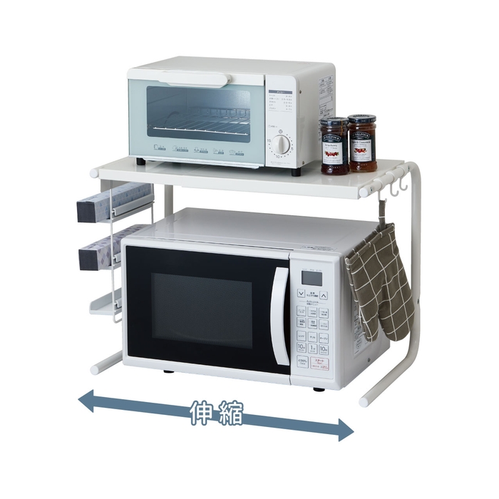 ■商品名:レンジ上ラック 高さ・幅伸縮タイプ フック・ラップホルダー付き