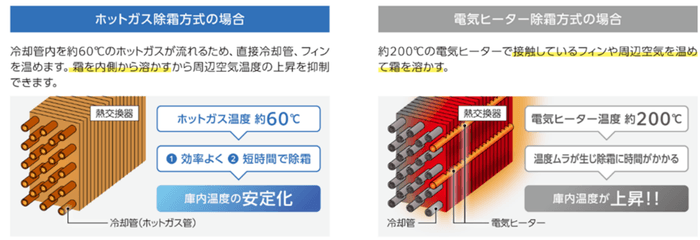 ・熱交換器にホットガスを流すことで、霜を内側から溶かすホットガス除霜方式を業界で唯一採用しています。一般的に用いられる電気ヒーターを使用した除霜方式に比べ、除霜時間が短くなり、庫内温度の上昇を抑制するとともに省エネにも貢献します。なお、本方式は「冷凍/冷蔵ZEAS」シリーズすべてのラインアップに採用しています。
