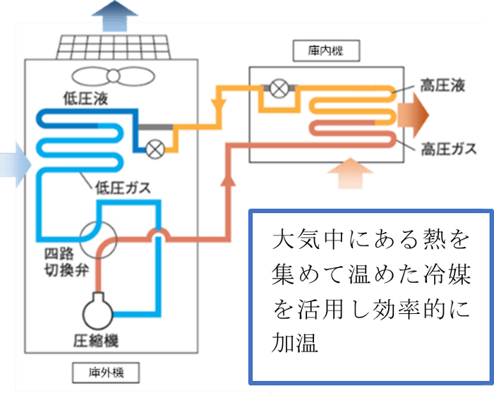・外気温が低い寒冷地では、庫内が冷え過ぎることで、保管物の品質を損なってしまう場合があります。従来は電気ヒーターを用いて庫内の冷え過ぎを抑制してきましたが、庫内を適正温度に調整することに時間がかかることや、消費電力が大きくなるといった課題がありました。ダイキンは、このたび冷蔵タイプに、四路切換弁を搭載し、冷媒の流れを逆転させることで庫内を暖める加温タイプを新たにラインアップします。ヒートポンプの技術を利用して効率よく冷却・加温を行うことで、常に庫内を適正な温度に保つことができます。