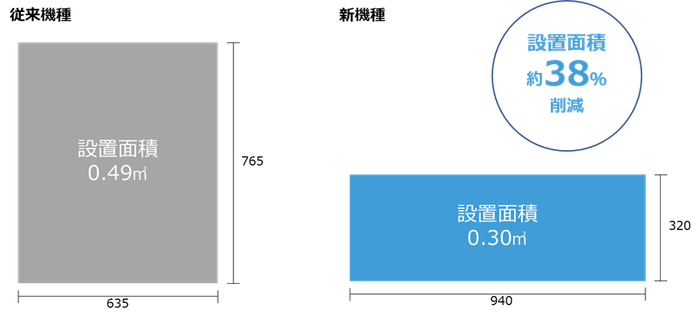 新型圧縮機を採用し、熱交換器を最適化することで設置面積を約38%削減しました
