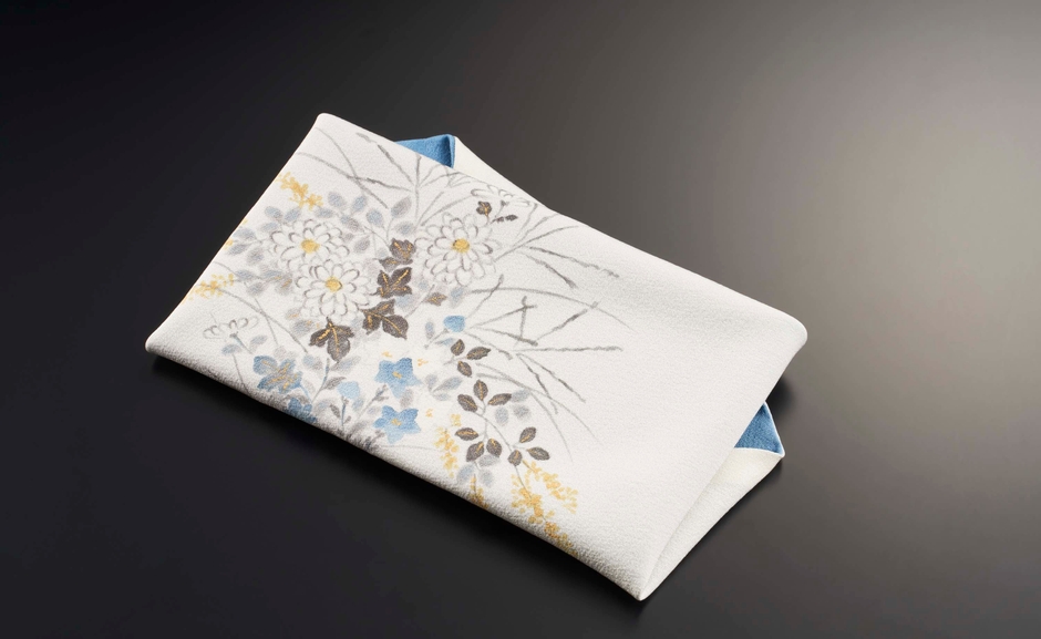 〈冬木小袖〉からイメージした薄藍色(うすあいいろ)と練色(ねりいろ)に染めた絹地をリバーシブルに仕立て、さらに東京手描友禅作家の岩間奨氏に秋草の模様を描いていただきました。生地の素材や気温、湿度などを見極めながら染め上げる東京無地染と繊細な東京友禅の手わざで美しく仕上げています。