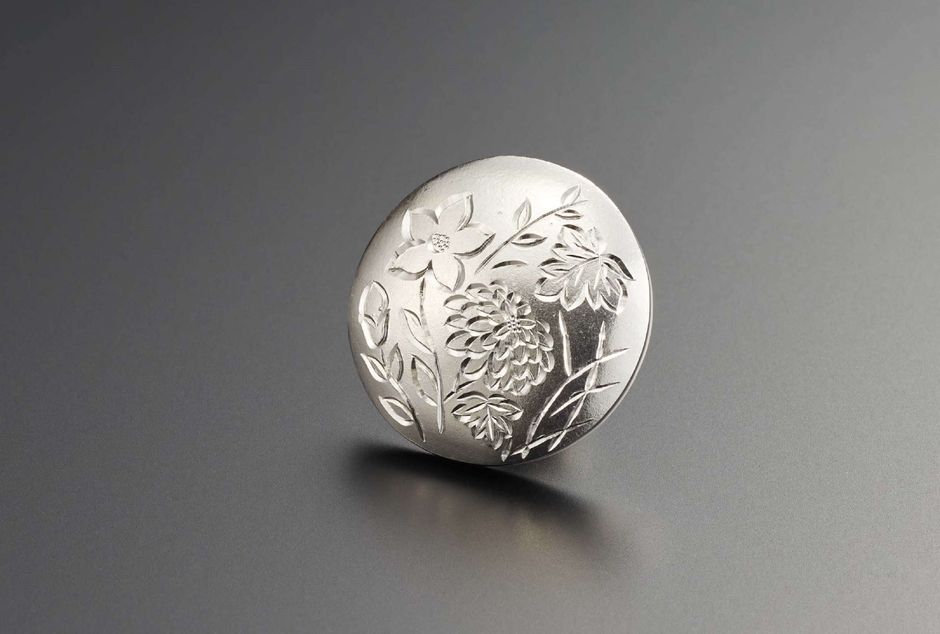 桔梗や菊、萩などの秋草模様を繊細な彫りで表現したピンブローチです。光琳らしいデザインを生かしつつ、秋草を配するバランスにこだわって作られています。胸元のアクセントに、また帽子やスカーフ、バッグなどにつけてもお楽しみいただけます。