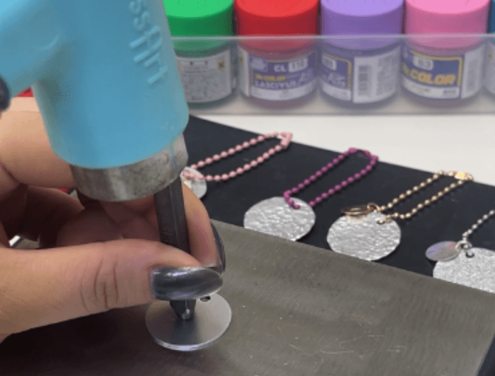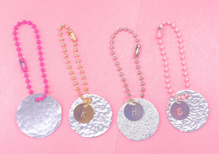 アルミ製のネームタグに、推しの名前や好きな文字・模様を刻印できるワークショップです。刻印した文字には色付けも可能で、さらにボールチェーンもお好みの色を選べます。アクセサリーにできるオプションもご用意しています。