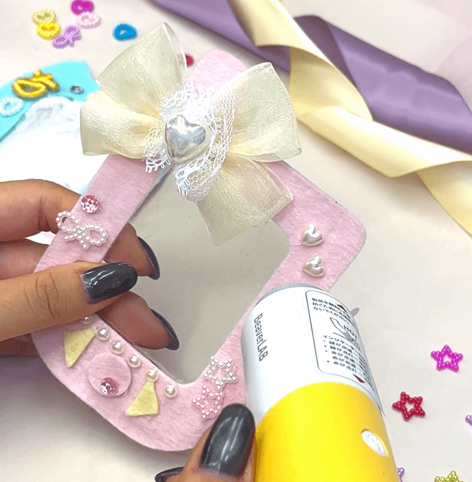 人工レザー+リボン1つ+パーツ付け放題のここでしかできないトレカデコができます。