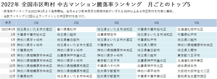 • 2022年の月別ランキングに2回以上ランクインした市区で、首都圏以外の市区は「兵庫県神戸市垂水区」のみだった。