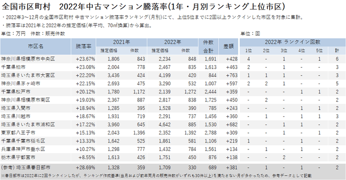 「マンションレビュー」のプレスリリースで注目エリアの1年を振りかえり! 全国市区町村 中古マンション騰落率ランキング 2022年の上位市区の相場を調査