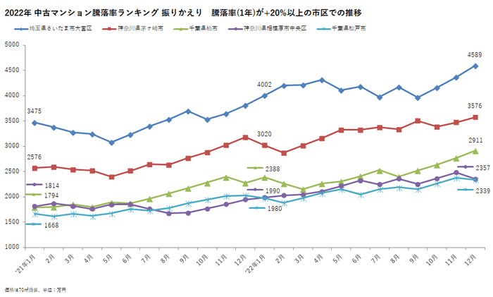 • 2021年の推定価格との差額がもっとも大きかったのは「埼玉県さいたま市大宮区」。前年と比較し、約760万円上昇した。