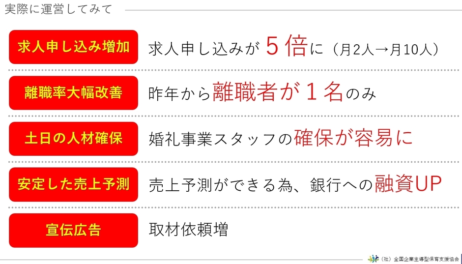 当社は企業主導型保育事業を導入した結果、採用を効率的に行えるようになりました。月間の求人申し込み数が今までの5倍、離職者が今までの1/6、土日の人材確保も容易になりました。