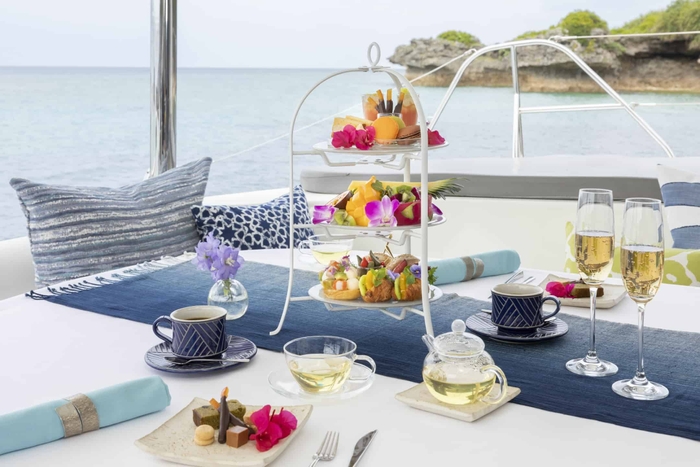 航海中は、沖縄の美しい海を眺めながらティータイムを楽しみます。専属バトラーが用意する3段のティースタンドには、マンゴーやパイナップル・ドラゴンフルーツなどのトロピカルフルーツのフルーツプレートに、サクサクのクロワッサンを使ったサンドイッチ、そしてトロピカルフルーツのプティフールを盛り込みました。船尾にあるゆったりとしたソファーで、流れる景色を眺めながら優雅なティータイム時間を過ごします。