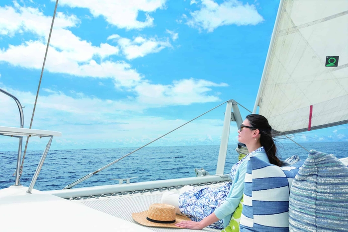 各施設が独創的なテーマで、圧倒的非日常を提供する「星のや」。沖縄県・読谷村にある滞在型リゾート「星のや沖縄」では、2022年6月1日~8月31日の間、爽快なプライベートクルーズで始まるリゾート滞在「クルーズチェックイン」を提供します。空港からほど近い港から貸し切りのカタマランボートに乗り、海岸線沿いにある星のや沖縄へ向かいます。専属バトラーを務める、星のや沖縄のスタッフがもてなす約2時間の船旅では、船上でチェックインの手続きを行う他、トロピカルフルーツのスイーツを味わう優雅なティータイムを楽しみます。沖縄に到着後、いち早く海に向かい、海からの風を全身で感じるプライベートクルーズは爽快感に満ち溢れます。