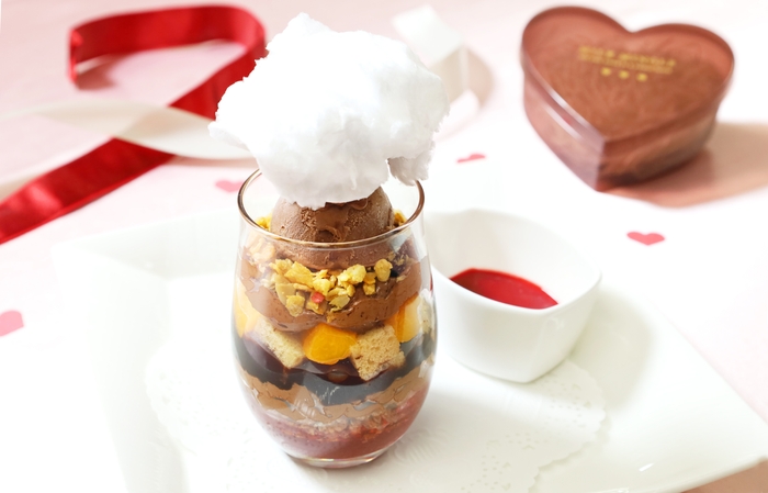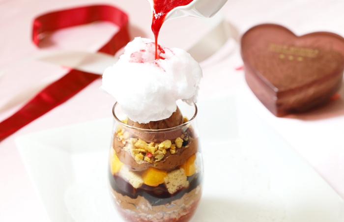 今回のトライフルは動画にも撮って楽しんでいただける、綿菓子にフランボワーズソースをかける演出を取り入れています。自家製の生チョコとストロベリーソースの下は、チョコクリスピー、チョコレートホイップ、チョコレートソース、チョコとバナナのパウンドケーキ、フルーツカクテルがレイヤードされ、しっとりとした舌触りで甘味と酸味のマリアージュをお楽しみいただけます。さらにマシュマロ、フルーツグラノーラ、チョコレートアイスが敷き詰められ、甘すぎずチョコ好きにはたまらない仕上がりです。