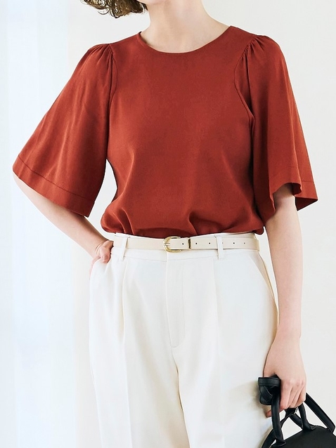 両脇にスリットが入れ前後差をつけている為、横からの姿もニュアンス感があり、二の腕をカバーするゆったりしたフレア袖でトレンドコーデを楽しんでいただけます。
