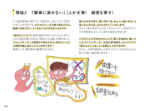 デジタルツールで描くときのように、簡単に消去(デリート)することができないからこそ、相手の話を「なかったことにしない」「どんな話も受け止める」「話の捉え違いも隠さない」ことが、ファシリテーターの誠実さやあたたかさ、潔さといった人間味を醸し出すことにつながります。結果として、場を深める要素になるのです。