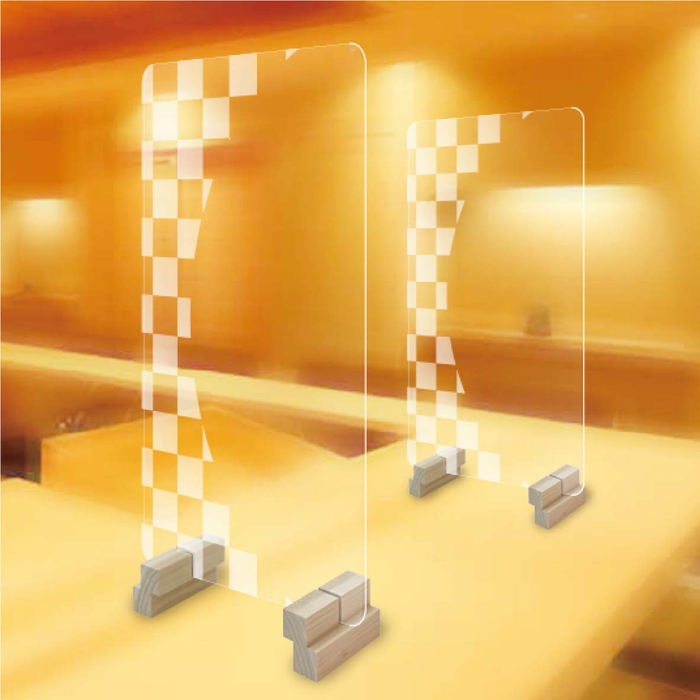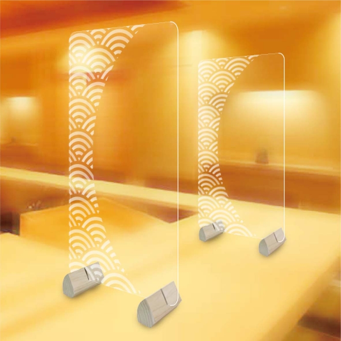 あたりまえのような透明アクリルパーテーションに飽きてしまった方へ、今までにない和風柄デザインの木製足付きアクリルパーテーションを開発しました。