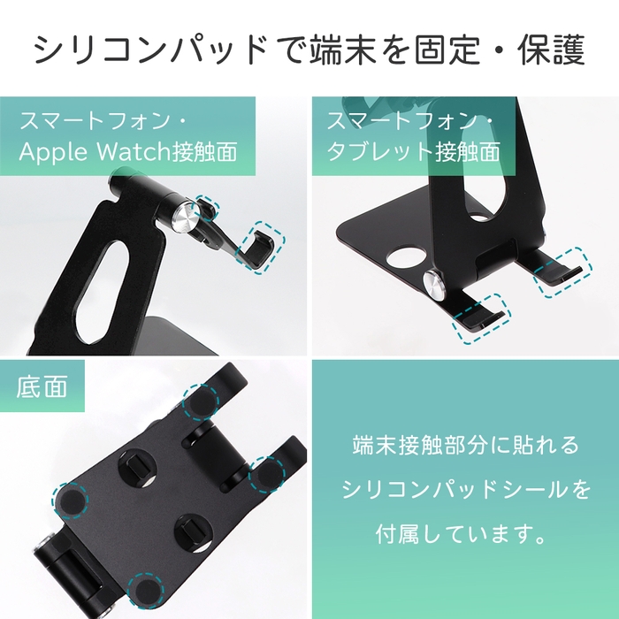 スマートフォンやタブレット、Apple Watch等の端末と接触する底面および土台部分には、シリコン素材のパッドが付いており、端末とスタンド、スタンドとデスクの設置面を保護しながら、滑り防止にもなります。