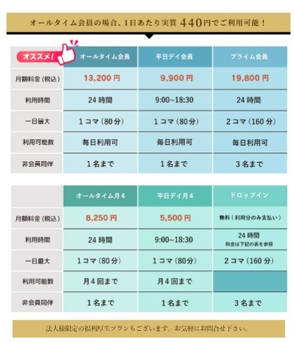 社員の方々の息抜きや趣味の充実、また、ご一緒に利用が可能なのでコミュニケーションツールの一つとしてご活用ください。金額等は対象人数によって変化いたします、詳しくはお問い合わせください。