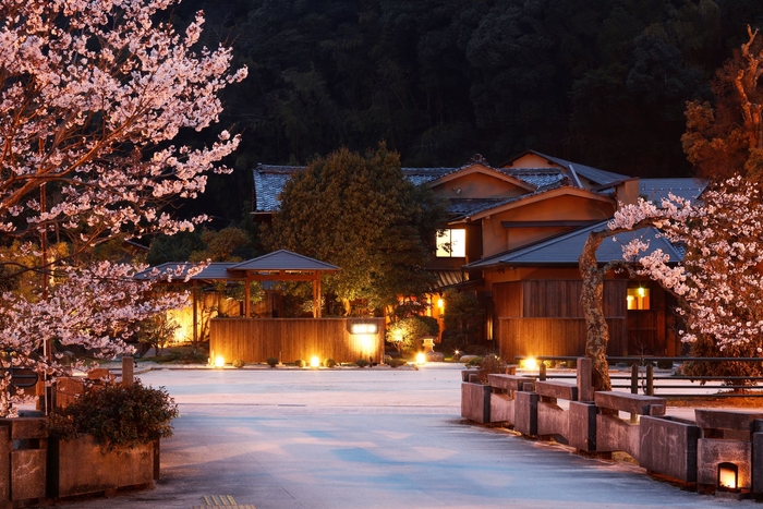 古くより、歴代の藩主もたびたび湯治に訪れていた長門湯本温泉。本陣として使われた御茶屋屋敷のイメージと、現代の建築を融合した造りが特徴の温泉宿です。宿の目の前を流れる「音信川(おとずれがわ)」沿いに、春になるとたくさんの桜が咲き誇ります。2022年の春には、夜桜が見上げられる川床テラスで贅沢な湯上がり時間を過ごすことができます。