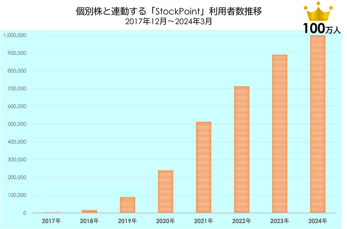 STOCK POINT 株式会社(本社:東京都港区、代表取締役社長:美好 琢磨、以下「STOCK POINT」)は、当社が運営するポイント運用サービス「StockPoint」を含む、『株価連動型ポイント運用システム』を活用したサービスの累計利用者数※-1が100万人を突破したことをお知らせ致します。