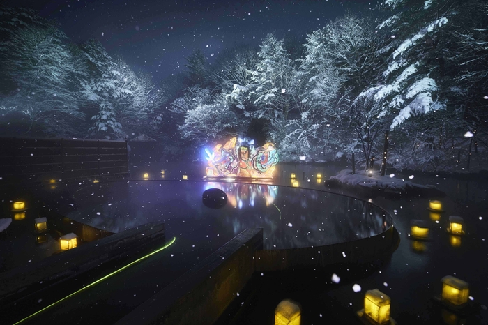 ねぶり流しとは、睡魔(すいま)を払い、穢れを川や海に流す行事である灯篭流しのことで、青森ねぶた祭の起源となったといわれています(*2)。青森屋では、露天風呂「浮湯(うきゆ)」の周りの池にねぶたの山車を浮かべ、この行事を再現しています。今では雪見露天風呂とねぶたを同時に楽しめる冬の風物詩です。