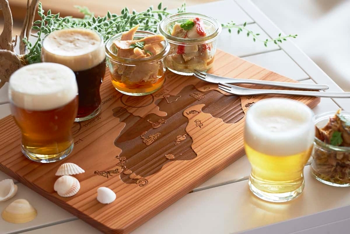 クラフトビールと缶詰のセット「カンカンビアプレート」を販売します。当ホテルスタッフおすすめのクラフトビールと缶詰それぞれ3種類ずつを1度に味わえるメニューです。プレートには静岡県の地図が描かれ、提供するビールの醸造所の位置が示されており、目で楽しむこともできます。